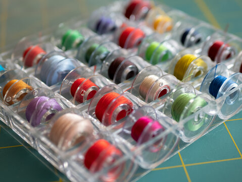 Bobbins with colored threads in the plastic box for storage. Sewing accessories concept