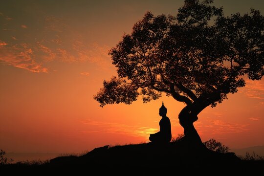 Silhouette of Buddha Sitting Under The Bodhi Tree at Sunset, Symbolizing Worship and Peace
