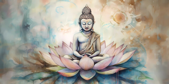 Abstract art of Buddha meditating on a lotus flower. Pastel light colors. Vesak Day concept.