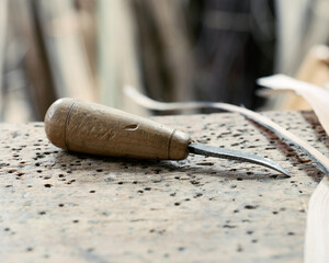 sharp steel sewing awl with polished wood handle cutout on white background