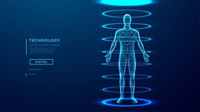 Abstract human body scan. AI doctor concept. Hologram 3D model of a man. Medical, health, and Anatomy. Digital male silhouette with neon light circles. Low poly wireframe tech vector illustration.