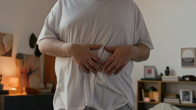 Medium shot of unrecognizable man lifting t-shirt up and palping his abdomen while standing in bedroom