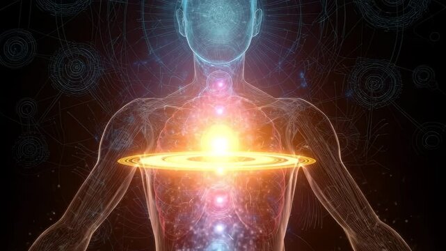 Human form illuminated by vibrant energy patterns against a dark background showcasing the connection between body and cosmos