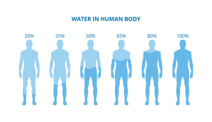 Dehydration concept. Vector flat healthcare illustration. Human body silhouette with blue liquid water level percents isolated on white background. Design element for summer time health care, ui
