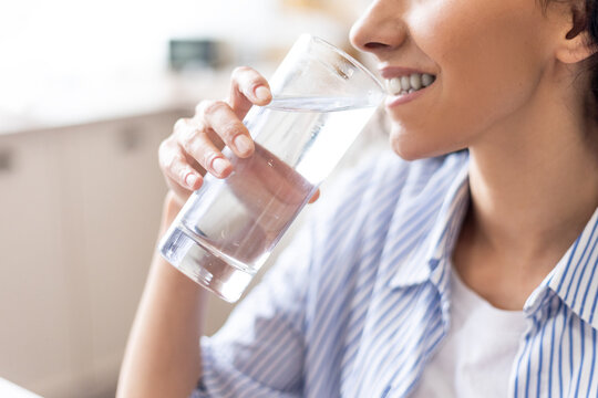 Body hydration concept. Young lady enjoying mineral water, thirsty woman drinking refreshing liquid from glass