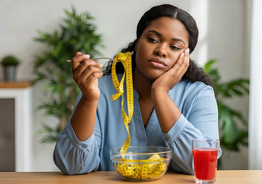 Sad African-American woman with measuring tape on fork, sitting indoors at table. Conceptual studio shot about unhealthy diet and negativity. Stress eating, mental health, weight loss journey.