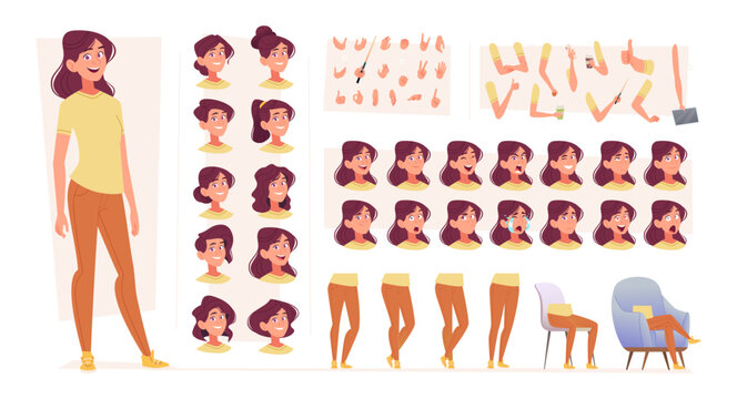 Young man cartoon character for motion design with facial expressions, hand gestures, body and leg movement