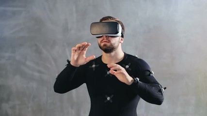 handsome muscular man wearing vr digital headset inside and enjoying the experience of full body movement in 3d simulated reality 360 degree motion capture suit sensors cyberspace hi-tech innovation