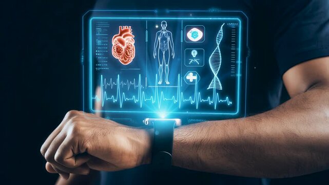 A smart watch projects a digital hologram showing real time body metrics, heartbeat data and health monitoring, wearable fitness technology, wellness tracking and modern lifestyle performance.