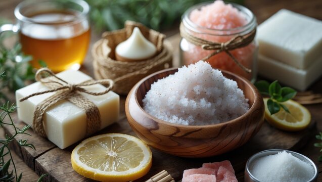 Close-up of cosmetic body care products arranged on a wooden surface.