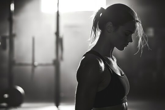 Woman with defined abs in confident power pose showcasing athletic physique in modern gym. Athletic achievement inspiration content for fitness center promotional campaigns