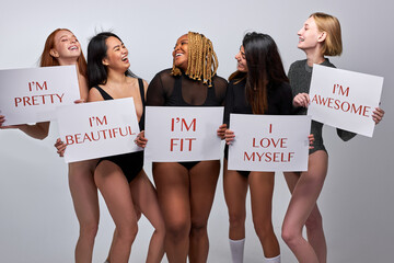 optimistic young models of different body size for bodypositive, convey the idea of loving yourself, be who you are