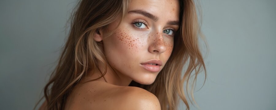 Close up studio portrait of pretty young woman. Girl with freckles on face and shoulder looks at camera. Natural makeup and fresh clean skin promote bodypositive trend. Model demonstrates youth.