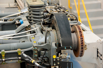 Closeup of a train wheel and suspension system on a railway track