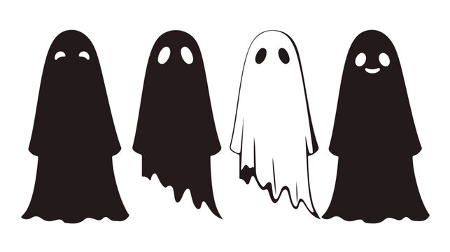 Black Halloween Ghosts Icons. Adorable Phantoms With Mischievous Expressions on White Background, Frightens