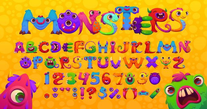 Bugaboo font of monsters and bogle typeface letters and scarecrow alphabet, vector type. Cartoon kids font of funny spooky characters in and bugaboo creatures, slimes and ogres with claws and fangs