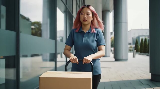 Young Asian female courier with pink hair pushing a hand truck with cardboard boxes along a modern city street