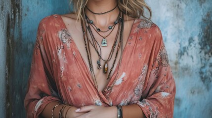 Woman Wearing Multiple Layered Necklaces and a Floral Dress