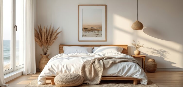 Coastal boho style bedroom interior. Wooden bed with white linens. Frame with landscape art. Cozy bedroom design with neutral tones, natural light, rug. Scandinavian, modern design for home decor.
