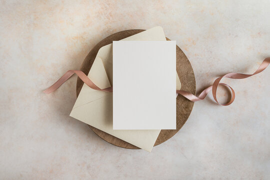 5x7 blank card and envelope mockup top view with pink ribbon