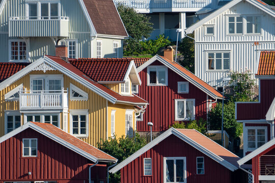 Swedish summerhouse and homes colorful facades and rooftops in archepelago of West coast Sweden, Bovallstrand by the Sea.