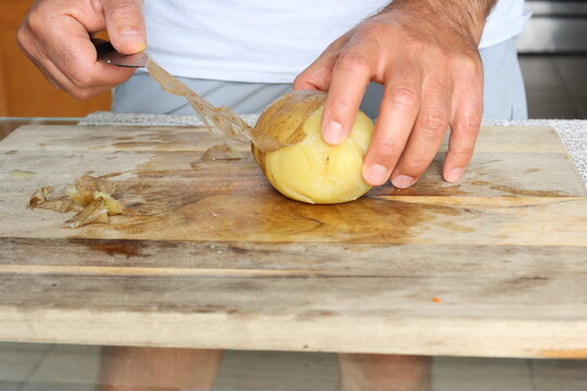 Human hands carefully removing the skin of boiled potato on wooden cutting board