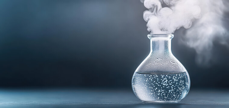 A laboratory flask emits steam and bubbles, surrounded by a mist, illustrating a chemical reaction or experiment in a scientific setting.