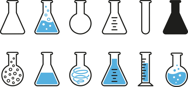 Chemistry Laboratory Equipment Icon Set Science Flask, Test Tube, Beaker, Measuring Cylinder, Experiments, Research, and Chemical Outline Vector Collection