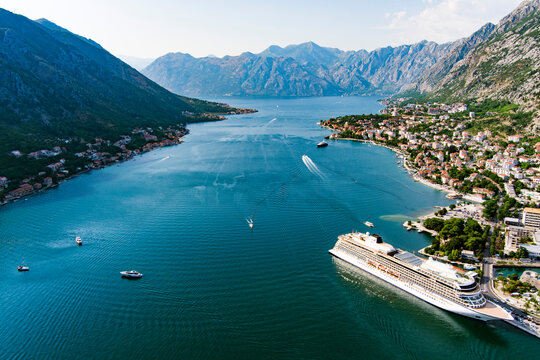 Montenegro. Bay of Kotor. The largest bay on the Adriatic Sea. The southernmost fjord in Europe. Drone. Top view of the city of Kotor. Tourist liner in the parking lot. Popular tourist place