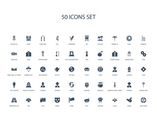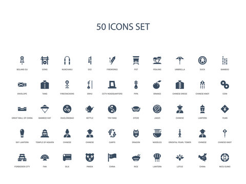 50 filled concept icons such as mizu gumo, china, lotus, lantern, rice, china, panda,silk, fan, forbidden city, chinese knot, chinese, oriental pearl tower