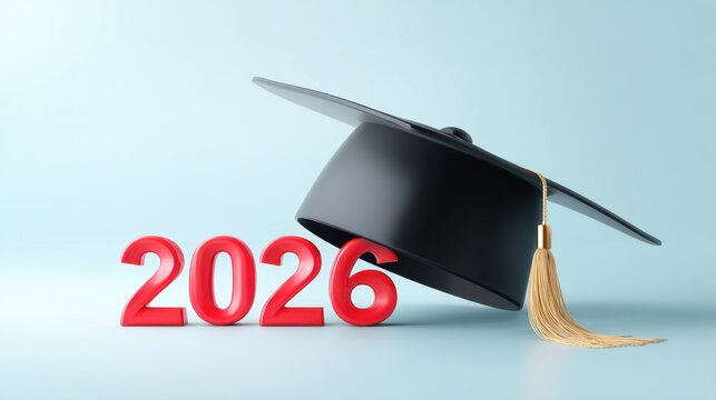 Classic black graduation cap mortarboard with a gold tassel beside bold red 2026 numbers, symbolizing academic achievement and celebration