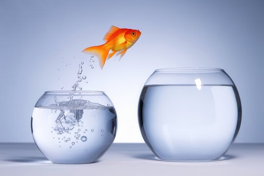 Bright gold fish leaping between bowls in a bold act of freedom display