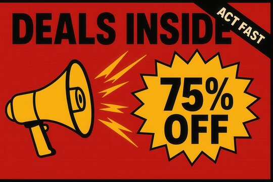 Eye-catching banner with DEALS INSIDE and 75% OFF discount offer, bold comic style, urgent retail promotion act fast.