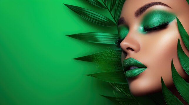 Green model advertisement with a striking makeup look featuring bold emerald shades
