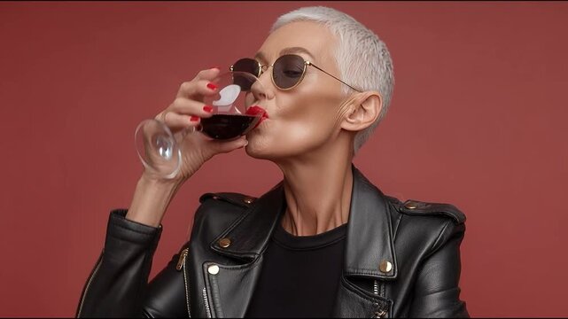 Joyful senior man wearing bright pink knitwear and wooden framed spectacles smiles widely against a vibrant background