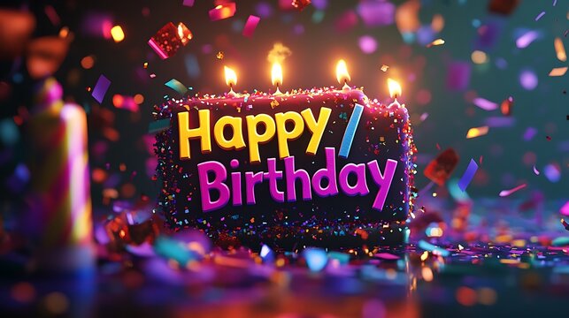A vibrant birthday card with bright confetti, candles, and a joyful "Happy Birthday" greeting in bold letters.