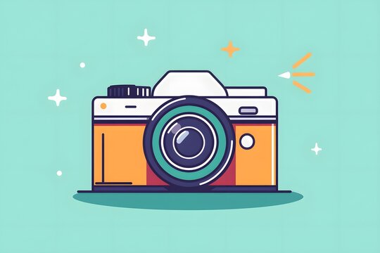 isolated illustration of a camera icon with a flash, using geometric shapes and a bold outline to symbolize photography