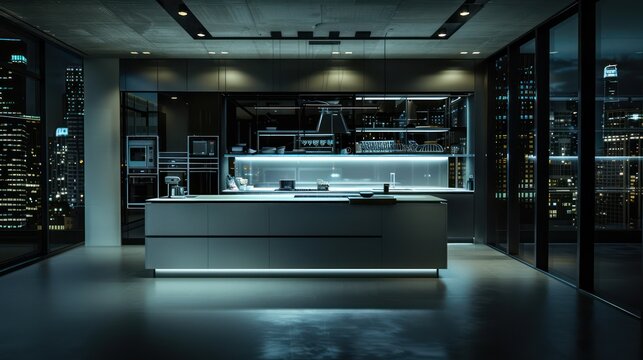 Modern kitchen interior with bold yellow cabinets and sleek white countertops.