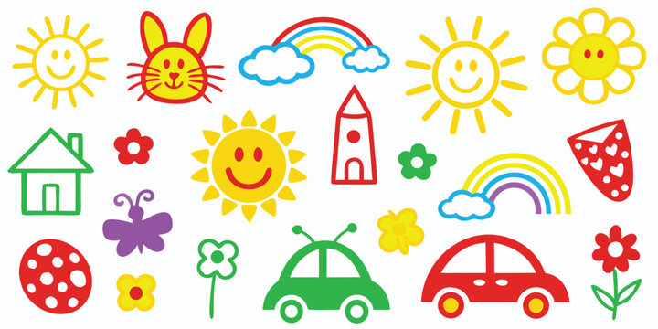 Vibrant chaotic collage of children s crayon drawings with bold colors