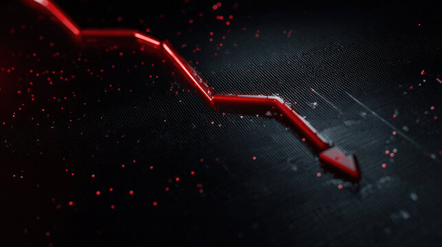 bold red downward sloping arrow on dark grid background with subtle data points dramatic glow financial crisis concept illustration concept scene visual for commercial design use high detail quality