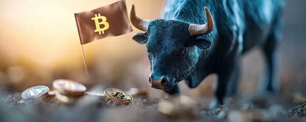 Black bull figurine with Bitcoin coins and flag on a blurred background