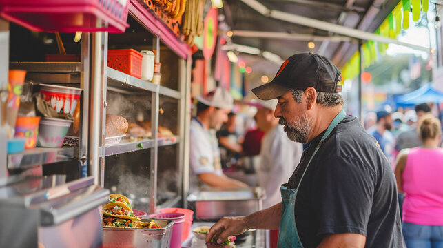 Vibrant Taco Food Truck in Urban Plaza Serving Authentic Mexican Cuisine with Latin Music and Colorful Murals