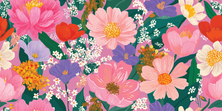 Vibrant Maximalist Spring Garden Floral Seamless Pattern. Bold Contemporary Bloom Repeat Background for Wallpaper, Textiles, and Decor