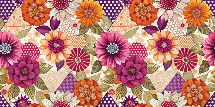 Vibrant floral pattern featuring colorful flowers in pink, orange, and purple shades.