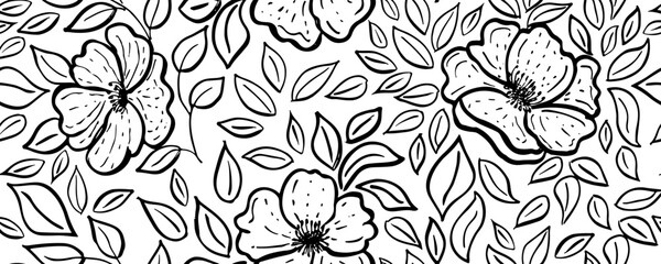 Trendy floral seamless pattern for fabric design. Flowers in Japanese style black and white texture. Summer vector illustration. Abstract grunge texture. Hand drawn brush pattern.
