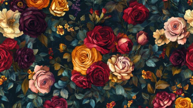 A maximalist floral pattern with bold oversized roses and vines in rich saturated colors modern romantic style