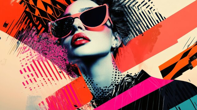 Retro-Futuristic Pop Art Fashion Portrait. A high-contrast pop art portrait combining retro and futuristic elements, featuring a woman in sunglasses with red and turquoise collage background.