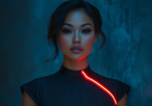 A dark minimalist background highlights a sleek, futuristic fashion portrait with bold lines and striking colors