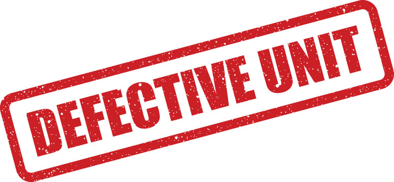Distressed rectangular red rubber stamp impression clearly displaying the bold text DEFECTIVE UNIT for production quality control