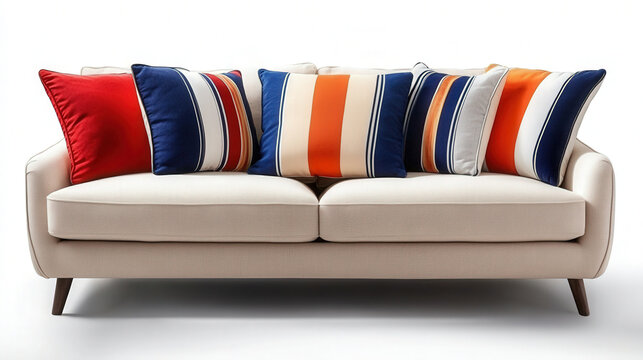 Pillows with bold striped patterns adding color to a plain beige couch